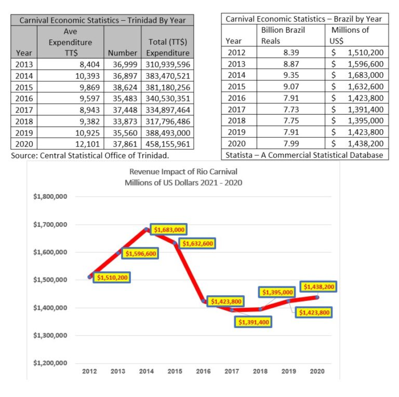 Due to its long reach in attracting tourism, in the extant literature, there is almost universal recognition that the economic costs and benefits of the West Indian Carnival event need to be analyzed. For example, the West Indian Festival has become a cultural export celebrated in London and Notting Hill (England), Tokyo (Far East – Asia), New York and San Francisco (USA) and Ontario (Canada). As far back as 2003, in England, the London Development Agency commissioned a review of the economic contribution of the Notting Hill Carnival to the local and regional economy. In April 2010, the economic impact of Caribana (The Carnival of Ontario Canada) was estimated to be worth about $438 million to the government and economy of Ontario1 . Other economic studies have shown that carnivals around the world enhance economic development of their host locations2 . Therefore, carnival induced festival tourism has created its own unique and identifiable source of tourist revenue. The financial gain of hosting a carnival is well illustrated data from Trinidad and Brazil as illustrated below in charts and tables. The economic significance of the Carnival is further illustrated by the lamentation of job losses due to COVID induced cancellations and loss of travel tourism. For example, in Brazil, tt has been estimated that about 25,000 temporary Carnival-related jobs would no longer be created in the first two months of 2021 due to cancellation of the Carnival in Brazil. In 2020 alone, tourism lost 437,900 formal jobs, with a 12.5% reduction in the workforce when compared to 2019.