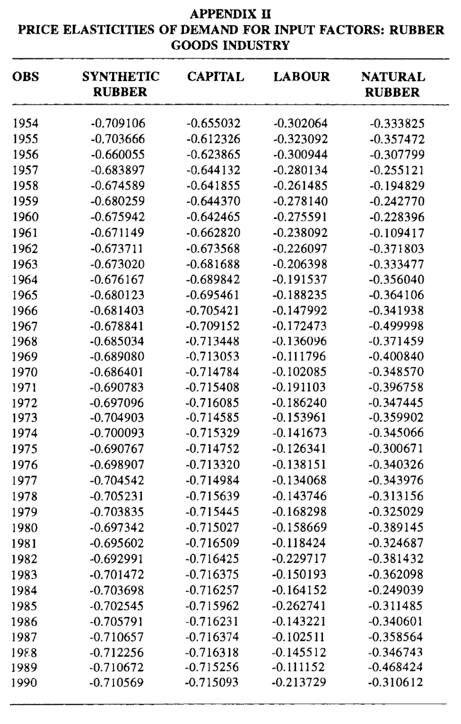 The cost function for the US rubber goods industry is homogeneous of degree one in prices, and positive in all input prices. The own price elasticities of demand (EKK for capital, ELL for labour, ESS for synthetic rubber, ENN for natural rubber) for the inputs factors (See Appendix II) are all negative, as expected. The share equations show that there is a progressive technical bias against the use of imported natural rubber, and in favour of the domestic factors, labour, and synthetic rubber. The bias parameters are respectively, -.0386, +.0448, and +.002. The results also show that a change in the price ration will induce a substitution away from capital, with a bias parameter of -.008. This result is somewhat surprising. However, a similar result has been obtained, for Japan, by Kuroda, Yoshioka, and Jorgensen (1984 ). Compared to natural rubber, however, rubber goods technology over time has been capital-using and natural rubbersaving, with a relative bias factor of .0467 (see Kang and Kwonk 1988). The most important observation, however, is the bias against the imported input, natural rubber.