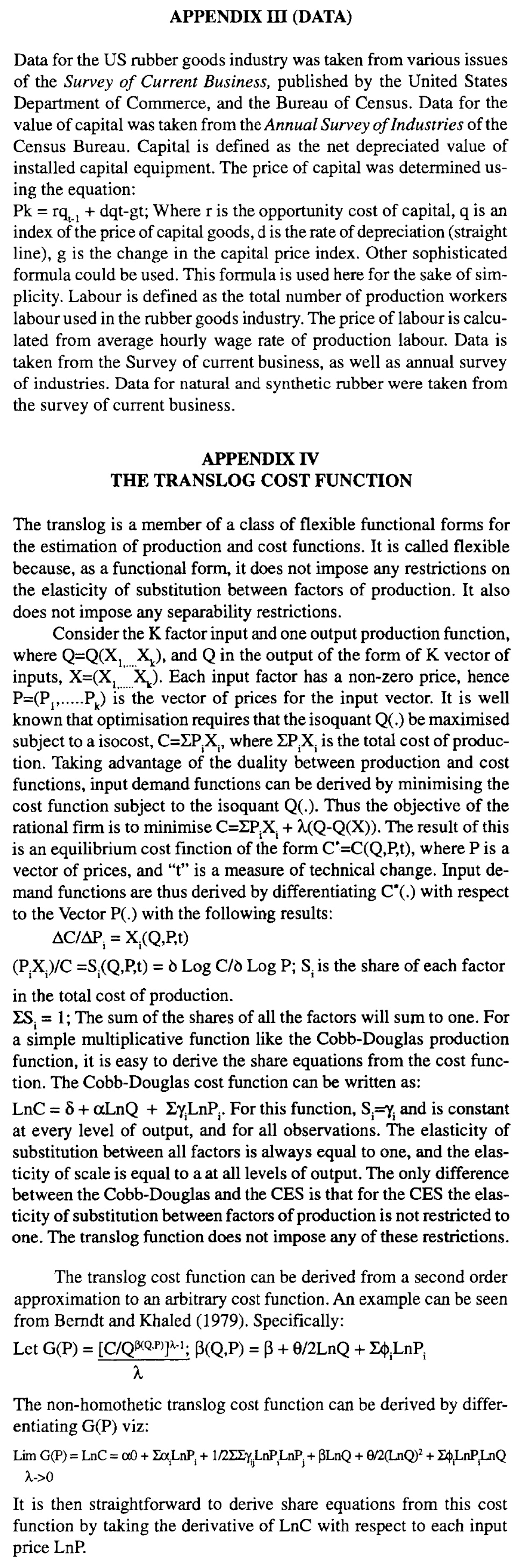 In the present study a total variable cost functions is specified and estimated. The model uses the US rubber goods industry to illustrate the bias in favour of domestic inputs against imported inputs. The purpose of the model is to determine if there is biased technical change in favour of synthetic rubber, capital, and labour, and against imported natural. The model is estimated using the joint generalised least squares (JGLS) procedure, through share equations. Data for the estimated equations is taken from various sources (See Data Appendix).